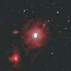 View of the spiral galaxy NGC 4897 and two nearby dwarf galaxies. This image combines an optical photo of the stars in white and blue colours with radio astronomical data showing the neutral hydrogen gas in red colour. Image credit: Legacy Surveys / D. Lang (Perimeter Institute) / T. Westmeier (ICRAR).