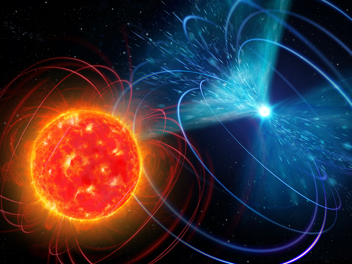 Artistic impression of the red dwarf and white dwarf interaction of the long-period transient GPM J1839-10. Credits: D. Futselaar/Horvath, Rea, Hurley-Walker et al. 2026